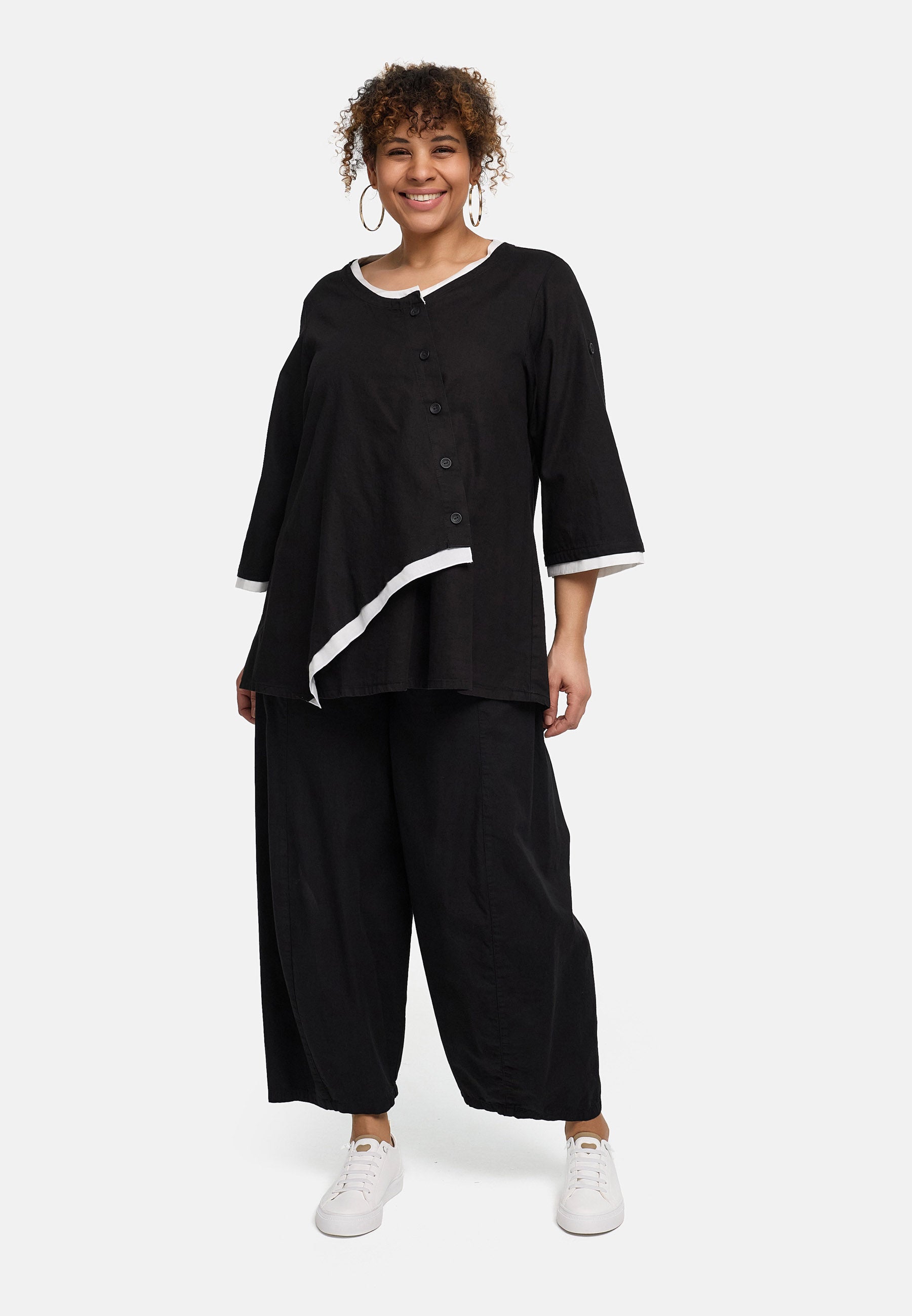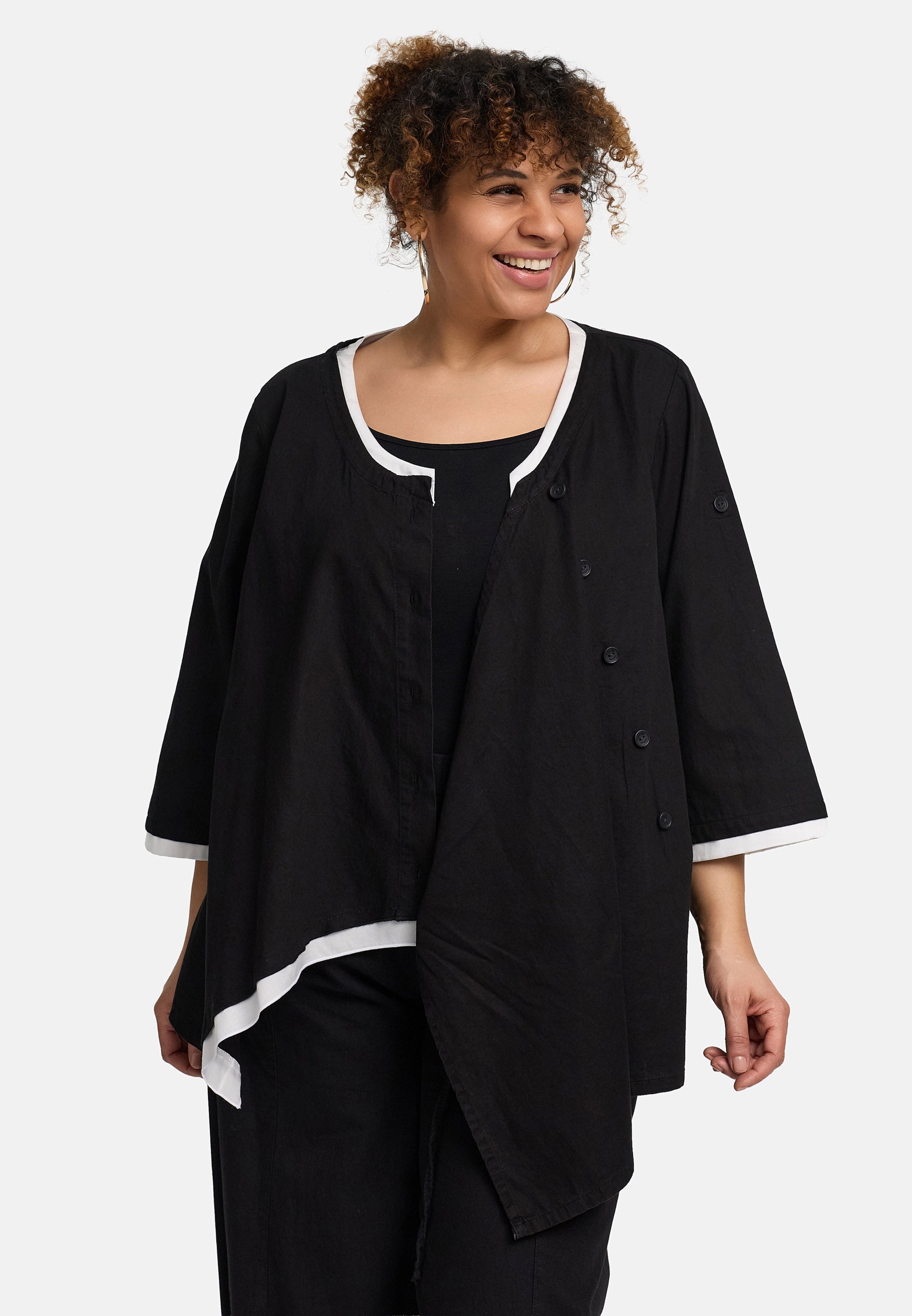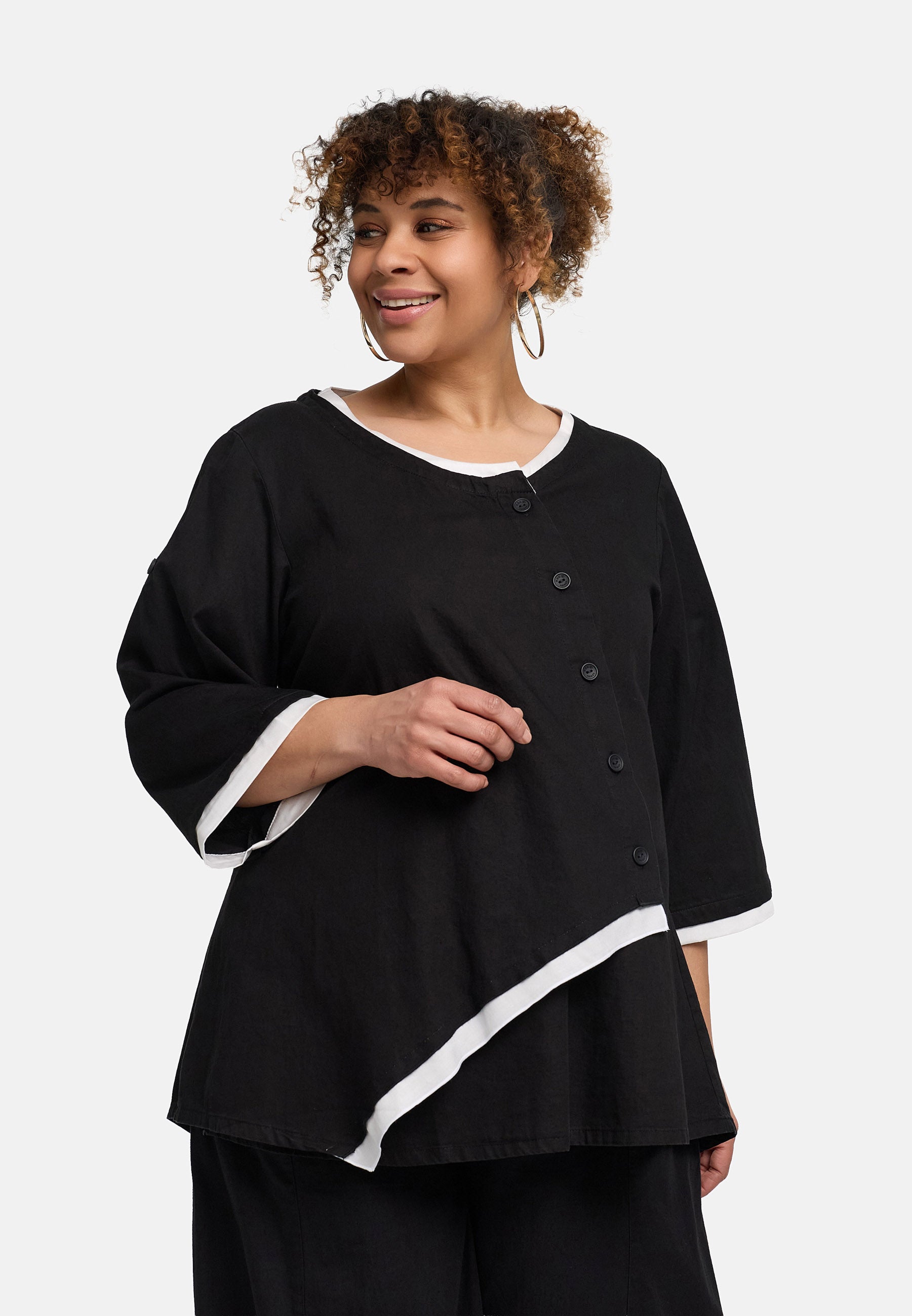 • Details: schräg verlaufende Knopfleiste, Rundhals mit Kontrastblende, 3/4-Ärmel mit Aufschlag & Fixier-Riegel, kontrastierende Offwhite-Kanten am Saum und Ärmel