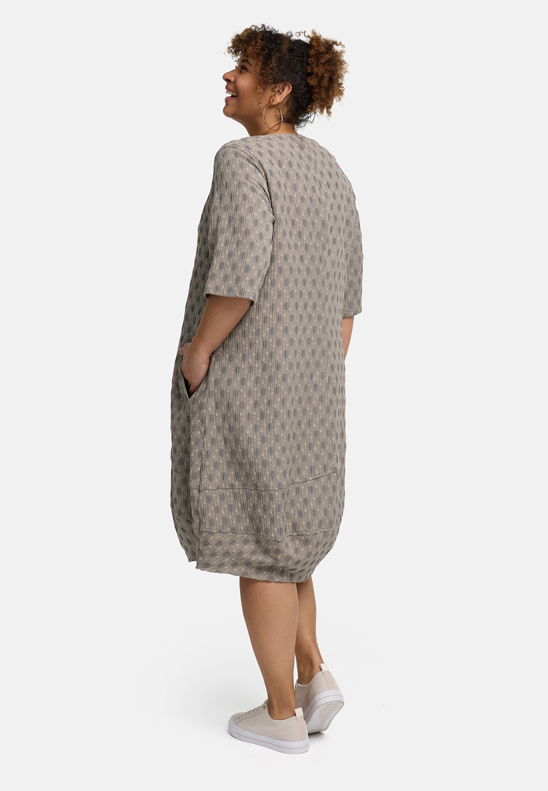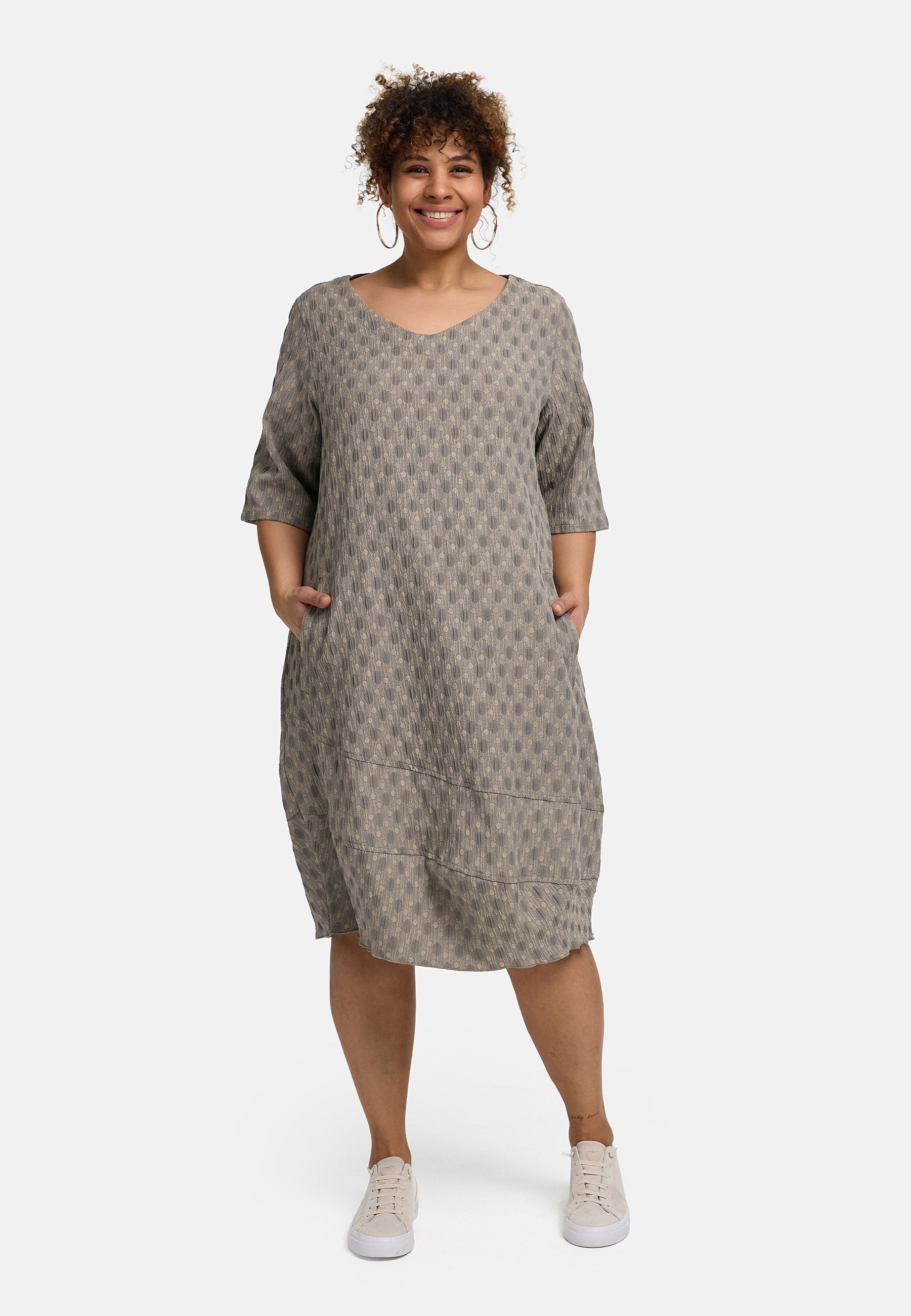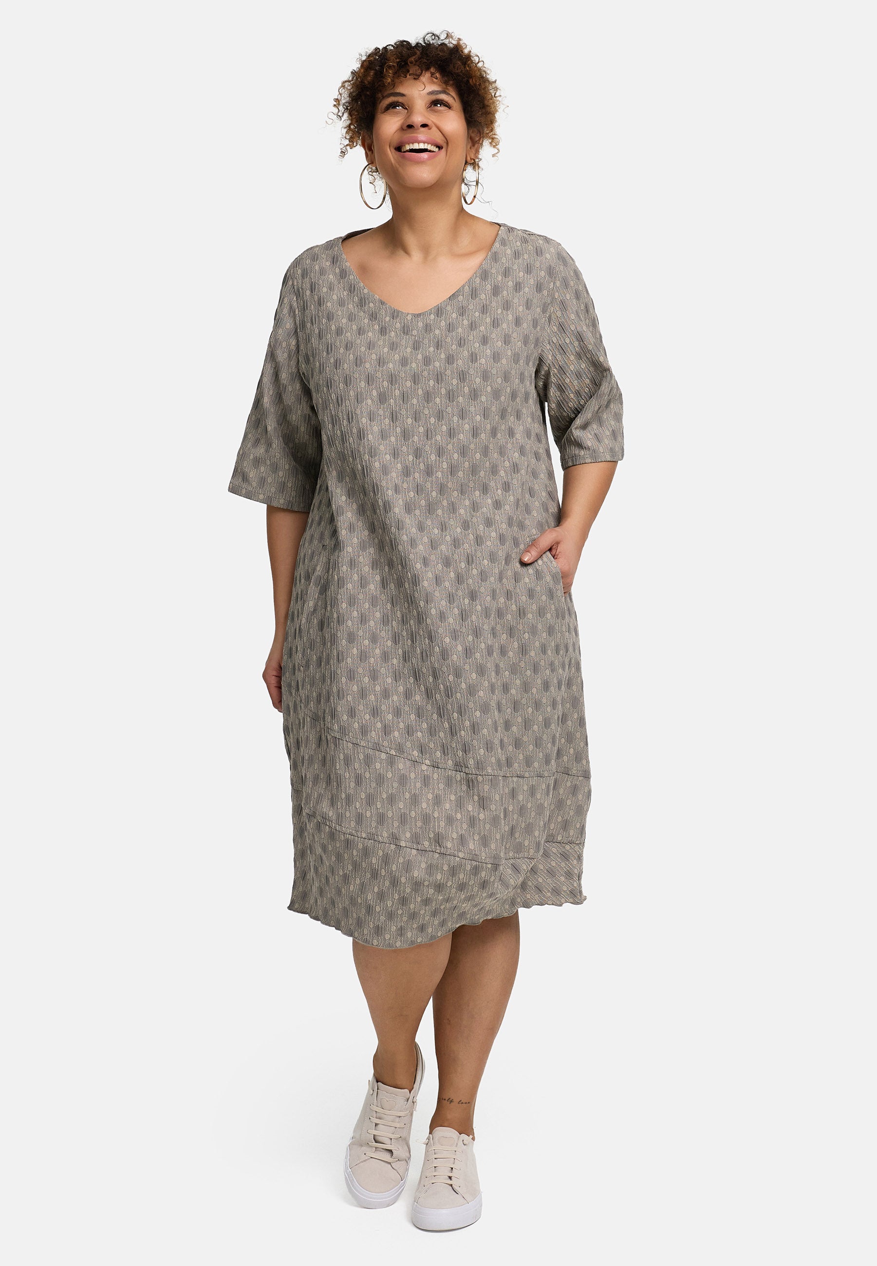 „Olina“ ist dein unkomplizierter Alltagsheld. Der fein strukturierte Jacquard bringt Tiefe und macht das Kleid besonders – ohne laut zu sein. Der sanfte V-Ausschnitt rahmt das Dekolleté, Halbärmel geben angenehm Lichtschutz, und die entspannte Silhouette fällt locker, ohne aufzutragen. Die breite Saumpartie mit geschwungenen Nähten setzt einen modernen Akzent und verleiht dem Look dezent Volumen.